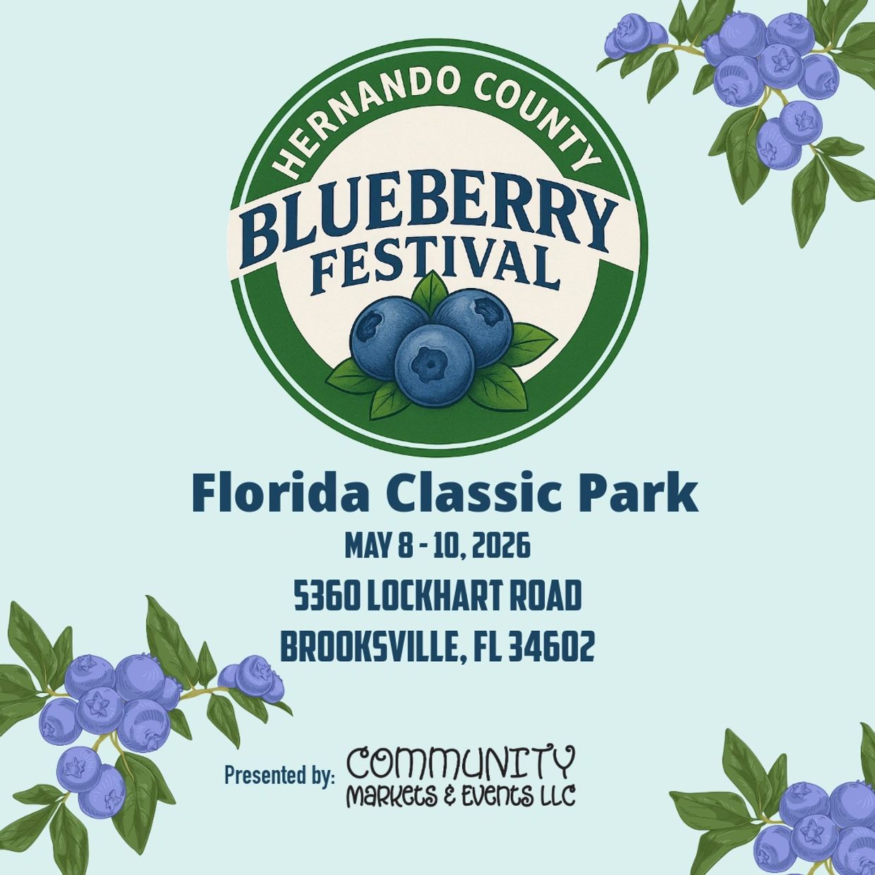 The Hernando County Blueberry Festival is coming May 8–10, 2026 — and you won't want to miss this berry sweet celebration! Join us for a nostalgic weekend filled with blueberry pie-eating contests, homemade recipe competitions, blue-ribbon livestock showcases, toe-tapping live music, and good old-fashioned county fun.